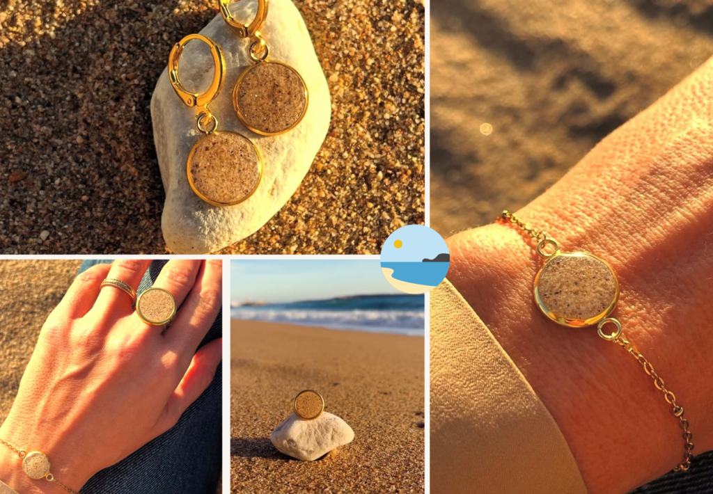 - Au centre du bracelet, de la boucle d’oreille, du collier ou de la bague, un médaillon en verre renferme du sable authentique