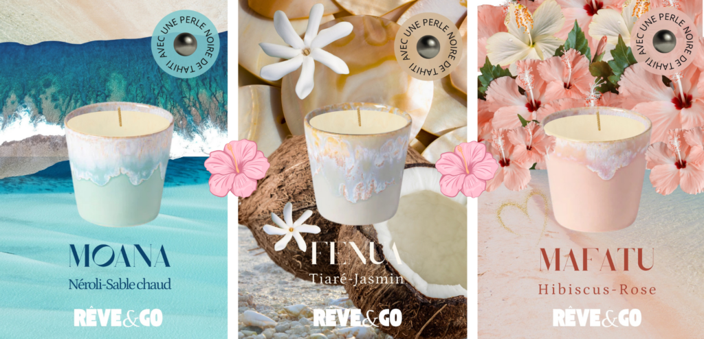 - Des senteurs qui allient l’exotisme polynésien à la délicatesse occidentale : Tiaré-Jasmin, Néroli-Sable chaud et Hibiscus-Rose